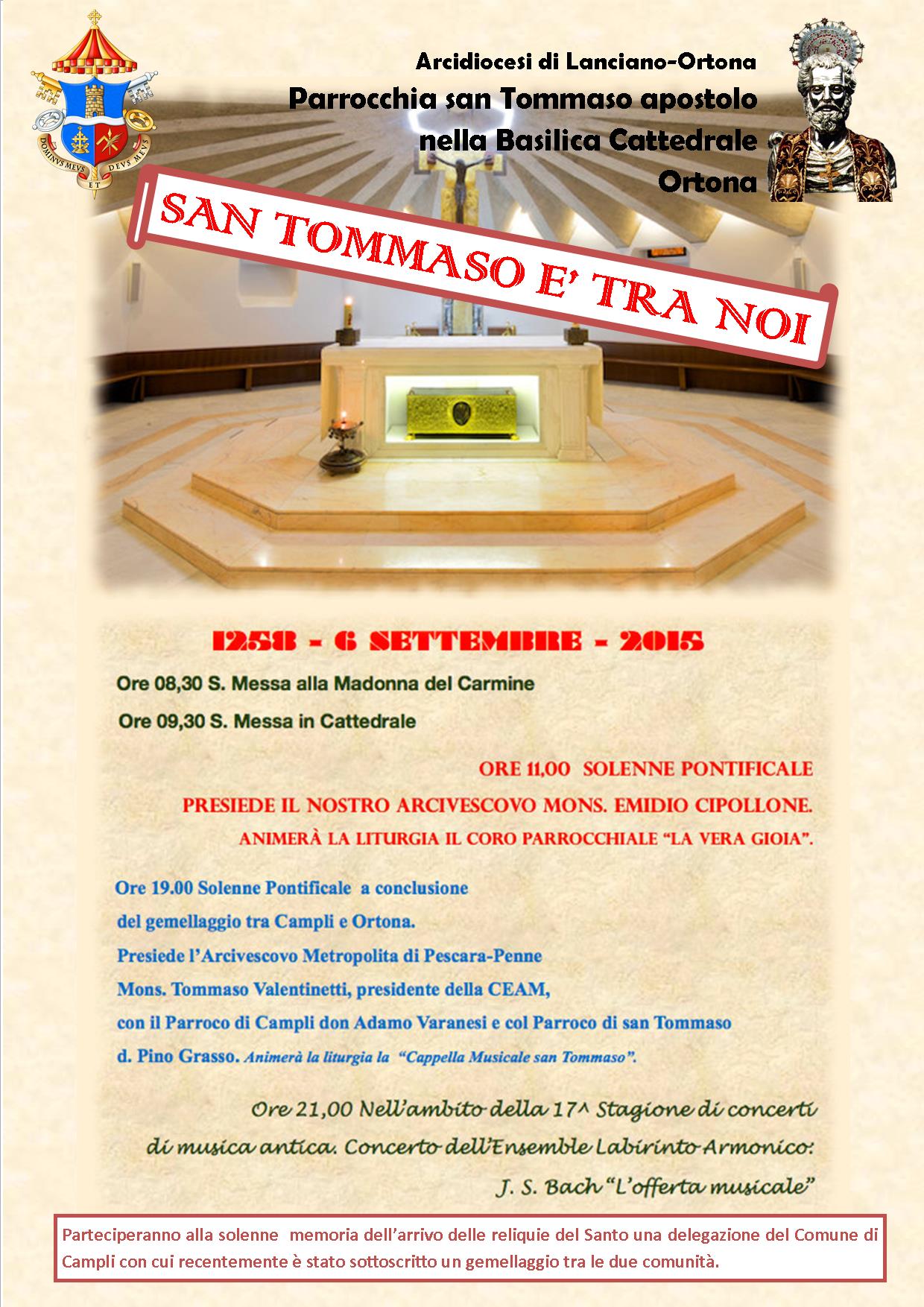 dell'Apostolo, la prima domenica di maggio si celebra il Perdono di s. Tommaso che ricorda l’arrivo a Ortona delle reliquie di s. Tommaso avvenute il 6 settembre del 1258. Questa data vogliamo ricordare e solennizzare sia in maniera liturgica che storica.